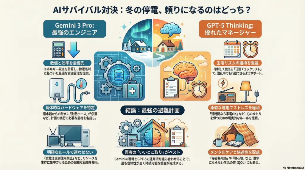 冬の停電時の避難生活についての、GPT 5 ThinkingとGemini 3 Proの回答を比較した AI