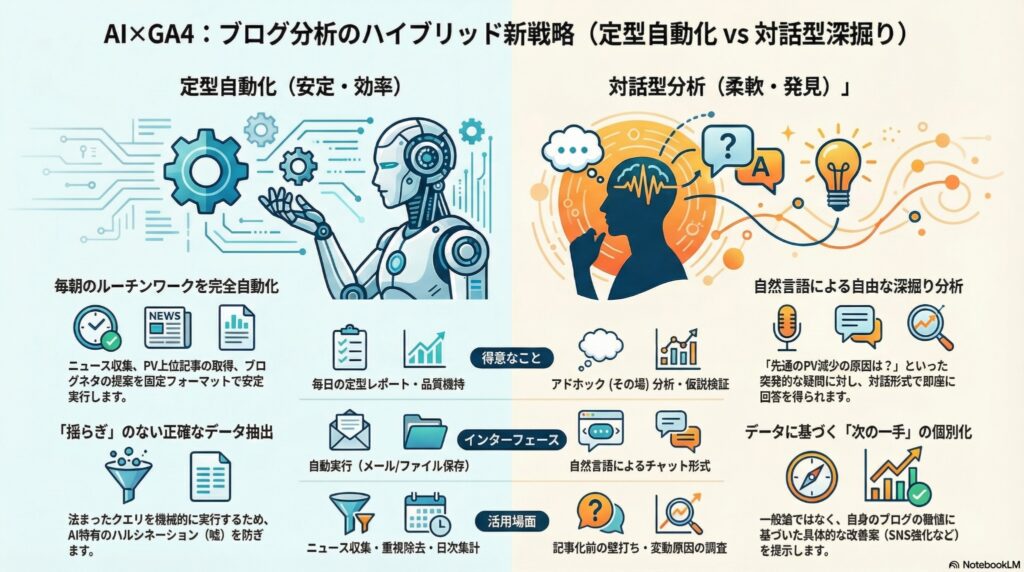 | MCPに回す | PV変動の原因分析 | 仮説ベースで対話したい領域だから | 「先週AI記事のPVが落ちた理由を見たい」 |