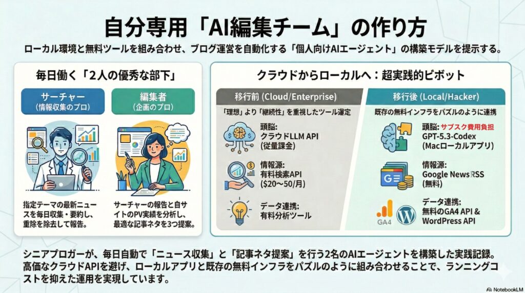 特定テーマに関するニュース配信をChatGPTのタスクとして設定し利用しているが、それらのテーマのニュースと、ブログサイトのPV上位の記事を参考にして、次のブログネタを提案してくれる仕組みを構築するために、Claude Code(Sonnet 4.6)に相談した。しかし、検討を進めていくうち、API利用料金が高くなる場合もあることが分かったので、最終的には、GPT-5.3-Codex(Mac版アプリ)を使うことにした。その経緯を紹介する。