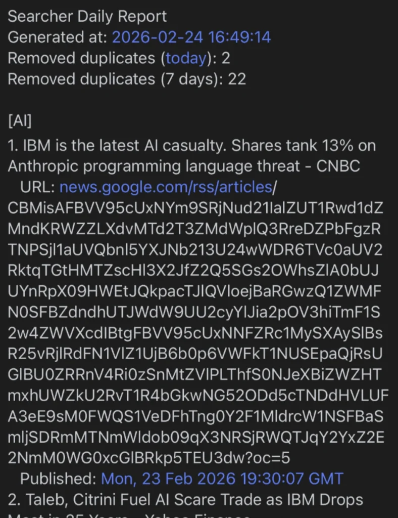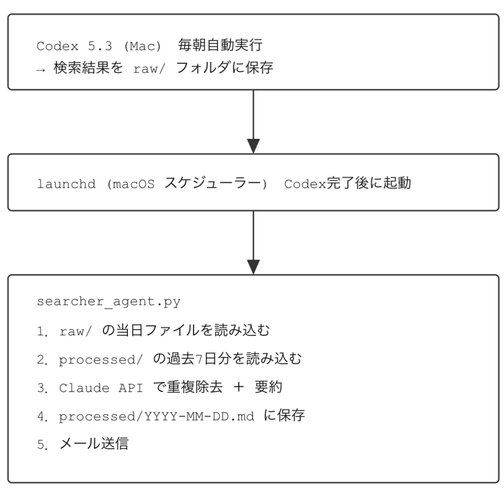 ・検索APIの費用が高いので、検索はCodex 5.3アプリ(Mac版)に任せ、毎朝、特定のフォルダに検索結果を保存させるようにする