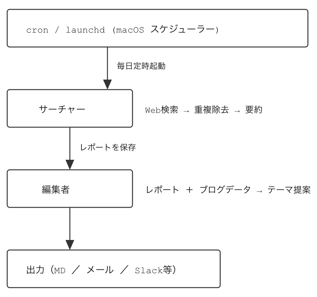 # ディレクトリ構成 ~/agents/ ├── searcher/ │ ├── CLAUDE.md # サーチャーの指示書 │ ├── topics.txt # 監視テーマ一覧 │ └── reports/ # 日次レポート保存先 ├── editor/ │ ├── CLAUDE.md # 編集者の指示書 │ ├── blog_data.json # ブログ記事・PVデータ │ └── proposals/ # テーマ提案保存先 └── run_agents.sh # 実行スクリプト