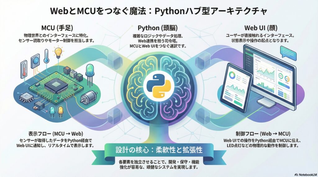 まとめると、センサ値は「MCU → Python → Web UI」へ通知・表示される流れ(notify / send_message)、