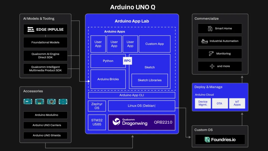 UNO Q上で動作し、アプリ(Linux側+MCU側)を 管理・起動/停止・ログ取得 など“運用するためのCLI”として位置づけられています(GitHubの説明もこの位置づけ)。(GitHub) - Linux OS(Debian)→ ハード(QRB2210)