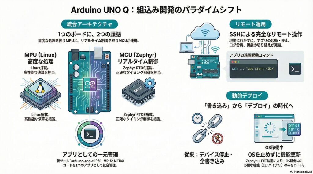 …という系になります。Zephyr系コアではスケッチをELFとして動的ロードする仕組みが説明されていますが、それをUNO Qで“SSHからどう操作するか”は、App Lab の管理経路に載っているかどうかで手段が変わります。 (Arduino Blog)