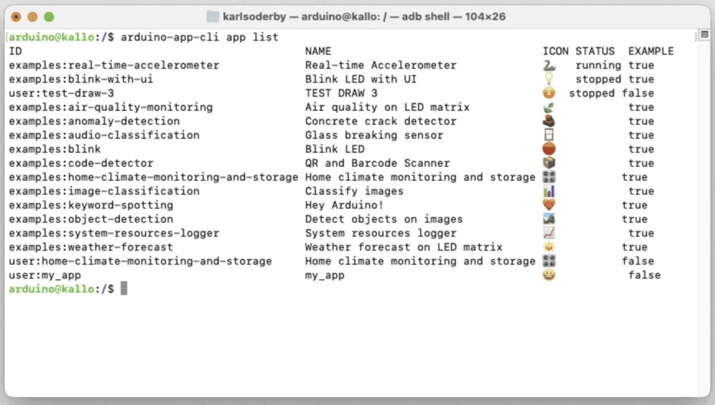 必要なら、この一覧から「特定のアプリの場所(パス)」「起動/停止」「ログ表示」へ繋げる典型操作(例:arduino-app-cli app start <ID> / ... stop <ID> / ... logs <パス or ID>)の流れも、画面の内容に合わせて整理できます。