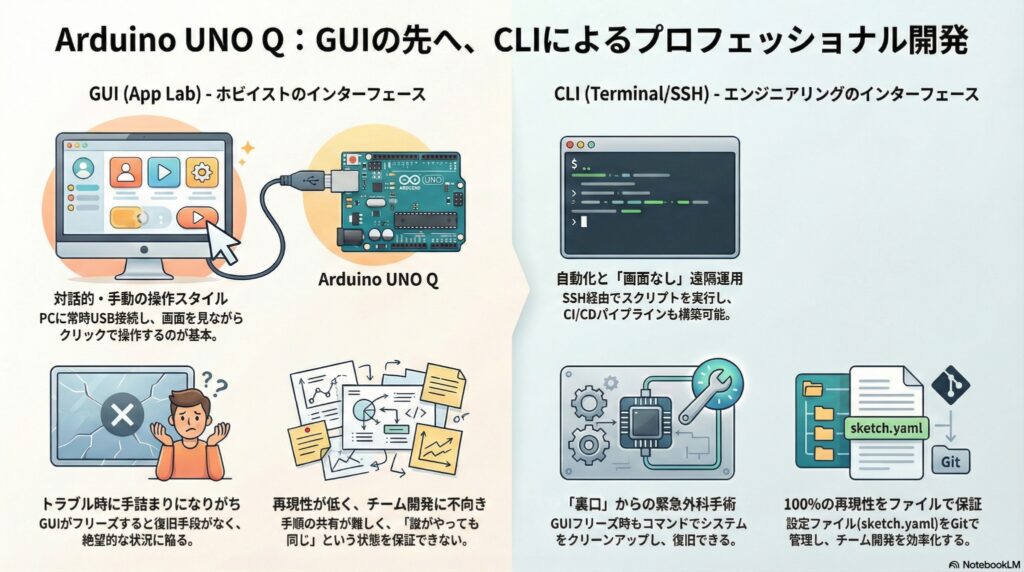 Arduino UNO Q の App Lab でいう「GUI(画面操作)」に対して、「CLI(コマンドライン)」が 実質的に必須になりやすいのは、だいたい次の領域です。