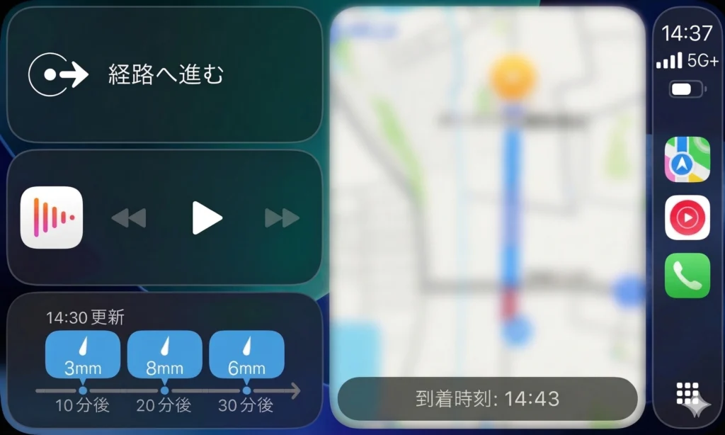 CarPlay は、地図、メッセージ、音楽だけでなく、音声会話アプリ、ナビ、駐車・給油・EV充電、簡易フード注文、運転タスク系アプリなどを車載画面に出せる土台になっています。加えて、ウィジェットとLive Activitiesも表示できます。