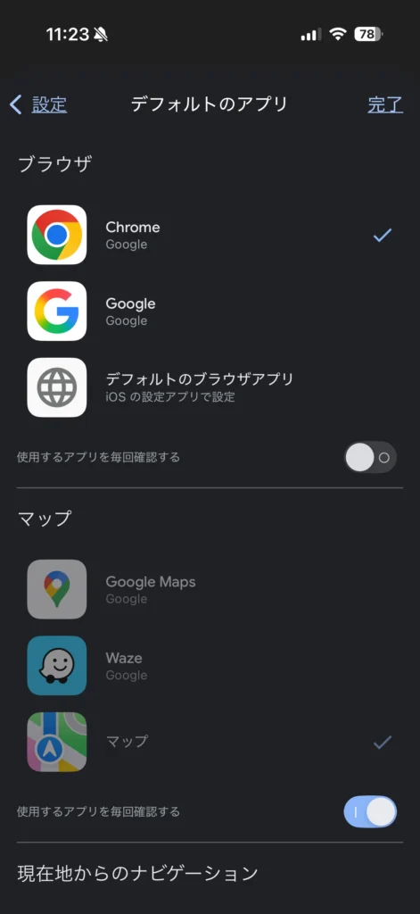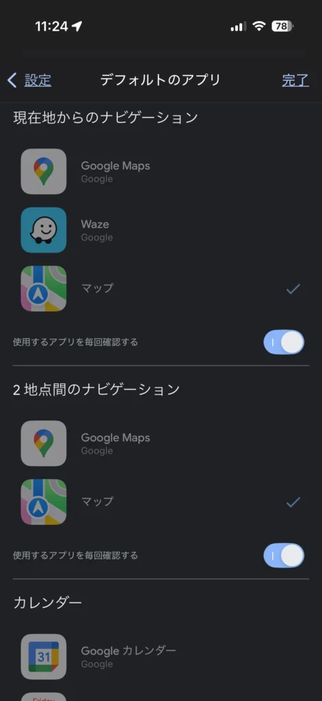 画像にある 「現在地からのナビゲーション」 や 「2地点間のナビゲーション」 のような細かい区分は、Apple の全体設定というより、Google アプリ内の独自ルーティング設定と見るほうが合っています。 (Appleサポート)