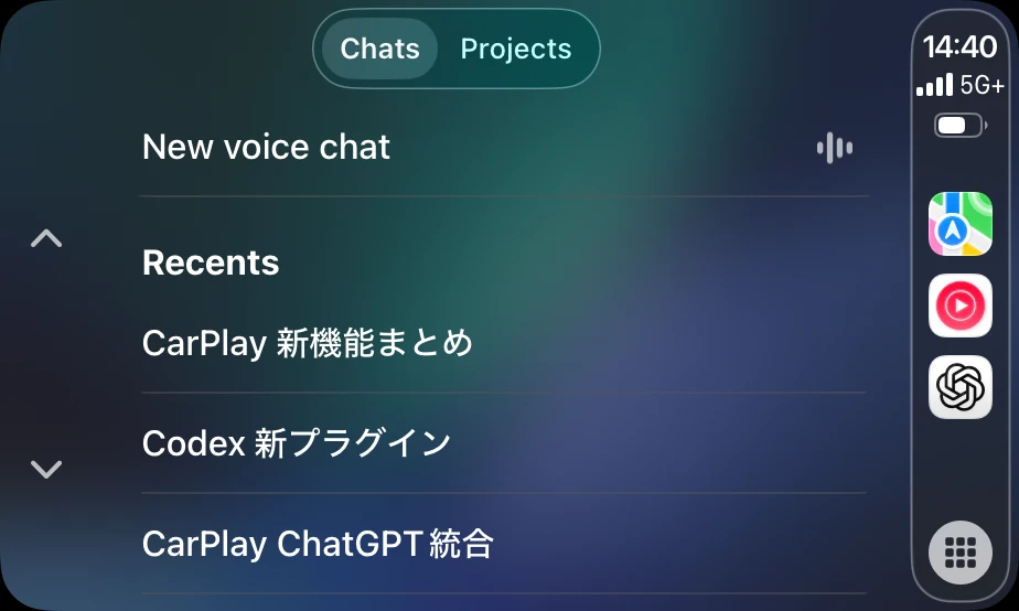 OpenAIの公式ヘルプによると、ChatGPT は iOS 26.4以降、対応する iPhone・最新のChatGPTアプリ・CarPlay対応車があれば、CarPlay画面から直接起動して音声会話を開始できます。