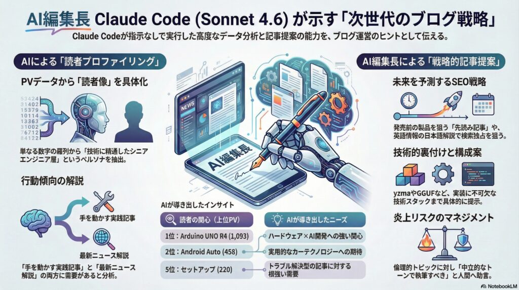 | ★★★ 最優先 | 提案1 (Arduino UNO Q × LLM) | PV1位記事の直接続編。再現性の高い実践記事は検索流入・滞在時間ともに高い傾向 |