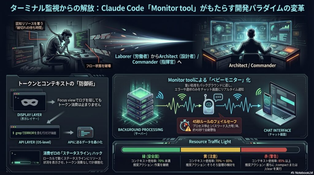 ツール説明(668トークン)によれば、Monitor toolは「バックグラウンドスクリプトのstdoutイベントをチャット通知としてストリーミングする」ものです。