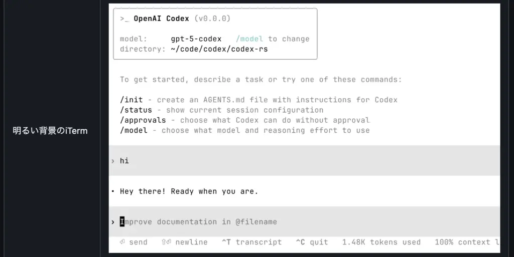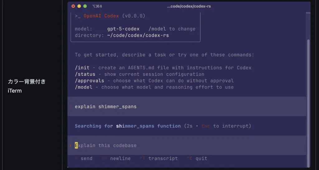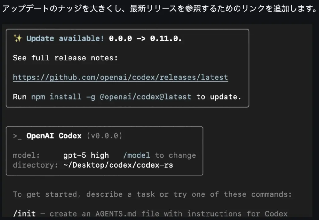 - レイアウトの一貫性:下に続く「OpenAI Codex (v0.0.0)」の情報パネルと明確に区切り、通知と通常ステータスの役割が分かりやすい。