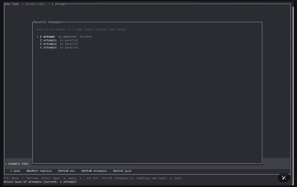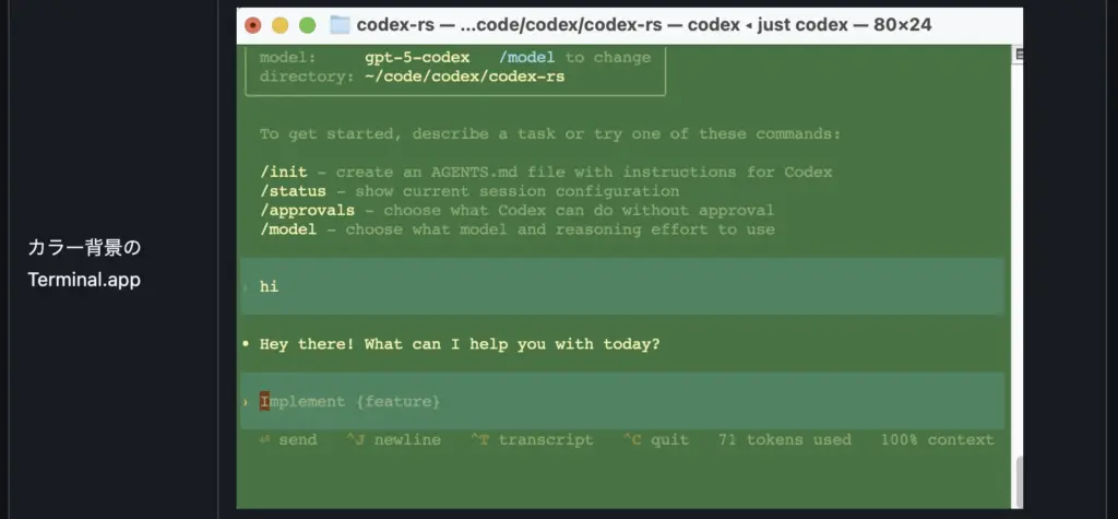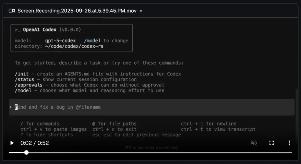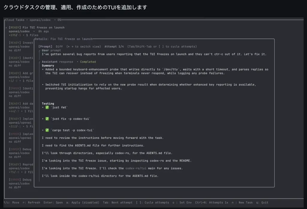 「?」でコマンド一覧を素早く参照可能に(操作発見性の改善)。(GitHub) codex exec