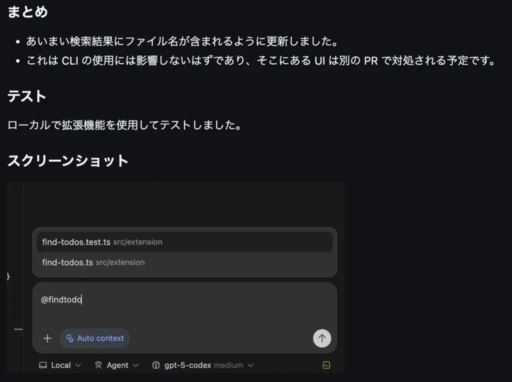 👉 これにより、Codex CLI 側(MCPクライアント)はコマンドやプロンプト候補に加えて“ファイル名のあいまい候補”を同じUIで提示でき、ファイルへ即ジャンプしやすくなります。