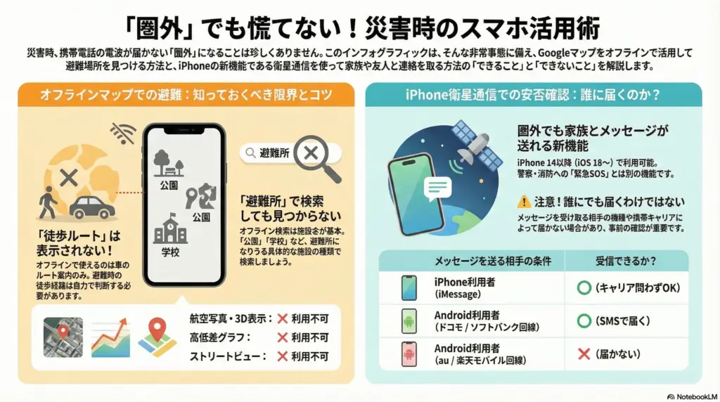 災害時の、旅行先である沖縄県での避難場所を検索する方法の限界と、災害時など、モバイル通信が使えない場合に特定のiPhoneで2025年12月9日から利用可能となった衛星経由通信について調べた。