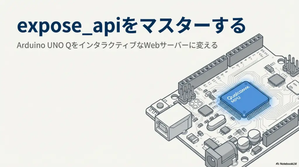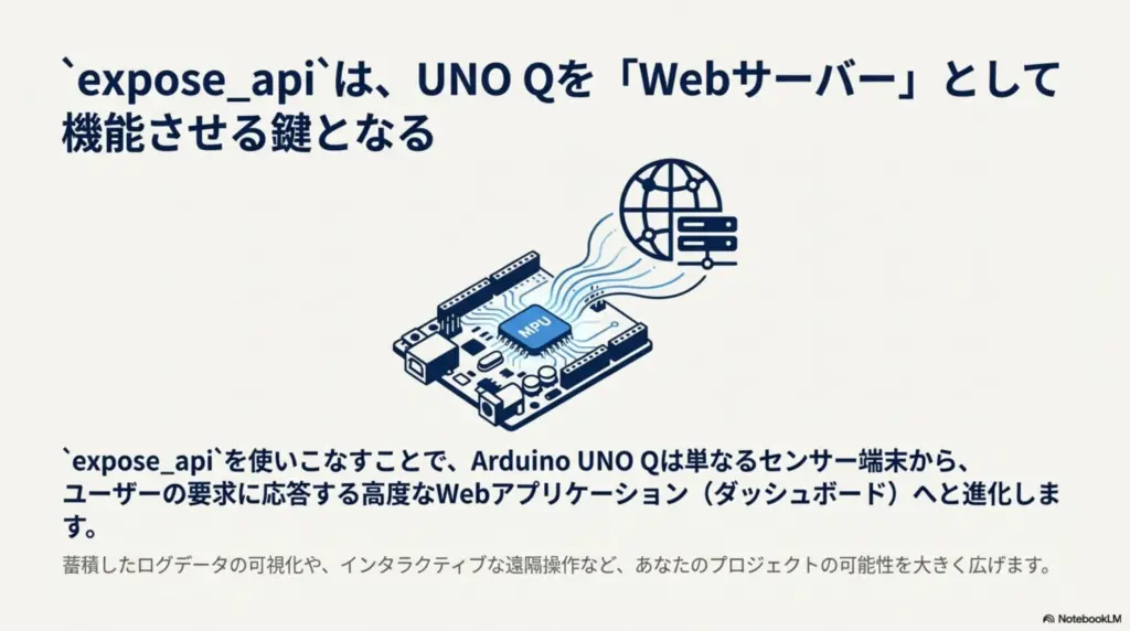 Arduino App Labでは、面倒な「Webサーバー作り(受付の設営)」は自動化されており、あなたは「expose_api(マニュアル作り)」に専念すればよい、という設計になっています。