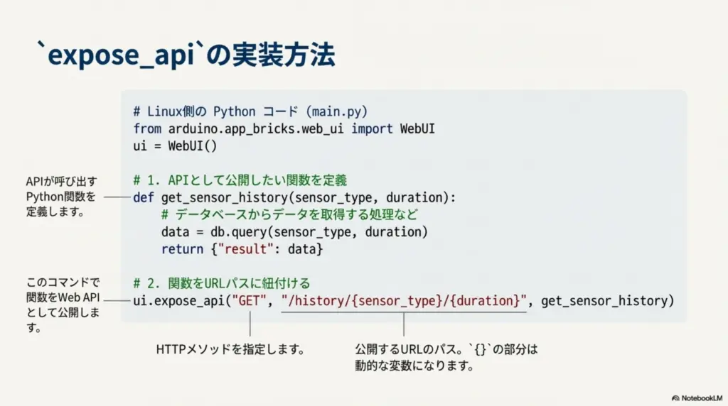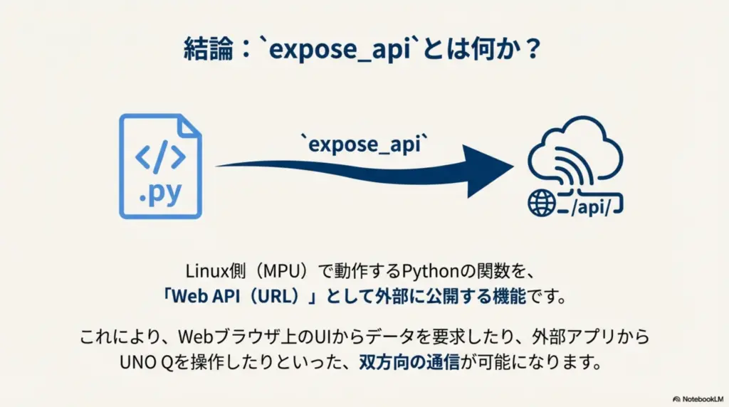 結論から言うと、expose_api は Linux側(MPU)で動作するPythonコードにおいて、特定の関数を「Web API(URL)」として外部に公開するための機能 です。