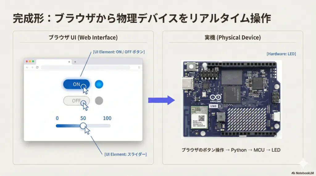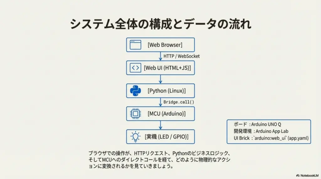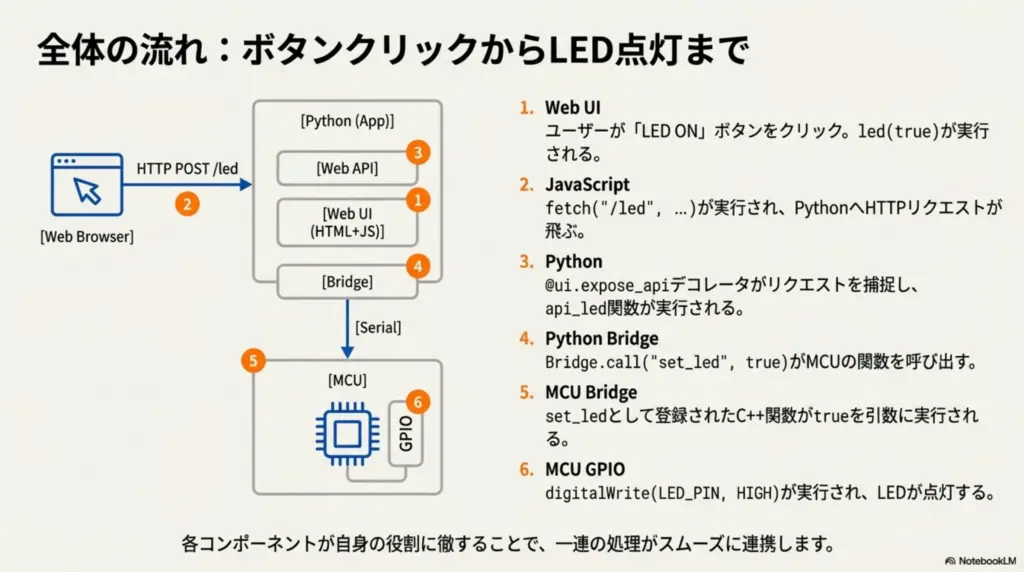 👉 ブラウザのボタン操作 → Python → MCU → 実機(LED/GPIO)