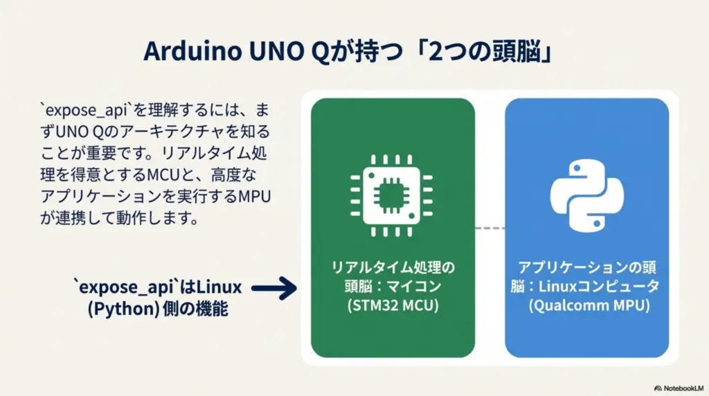 Arduino UNO Qは「マイコン(MCU)」と「Linuxコンピュータ(MPU)」の2つの頭脳を持っています。expose_api は Linux(Python)側 の機能です。