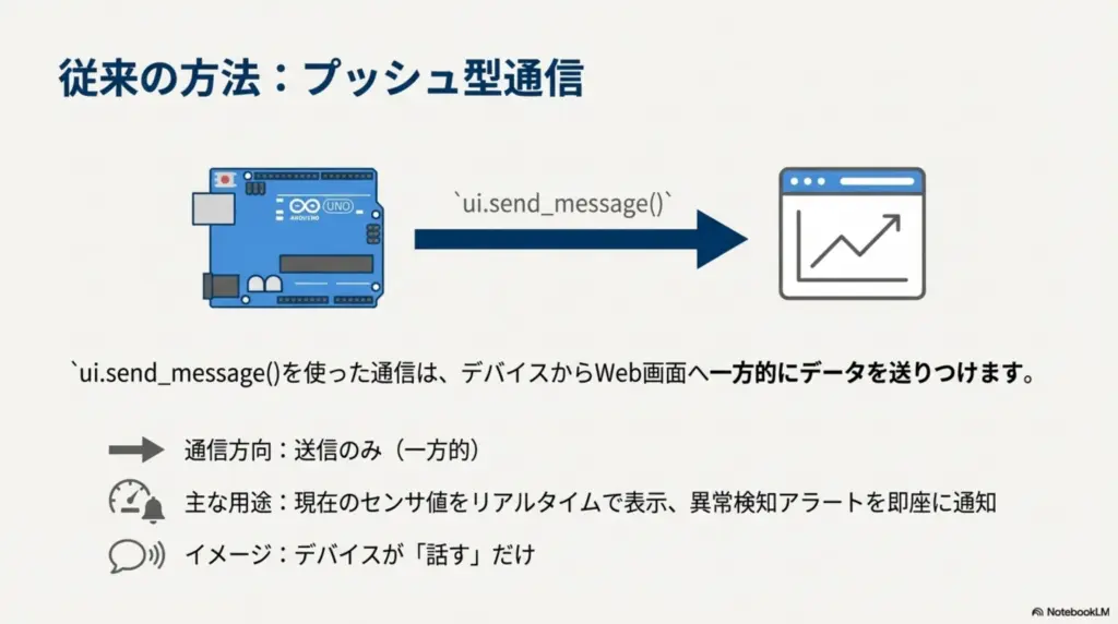 | send_message | ui.send_message() | Push (送信のみ) | ・現在の温度をリアルタイムで数字表示する ・異常検知アラートを即座にポップアップする |