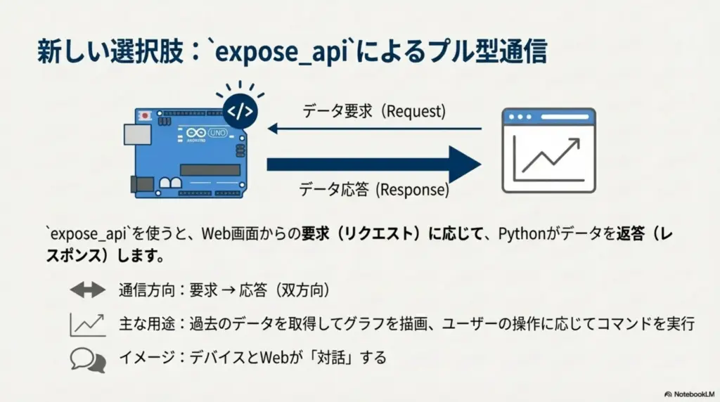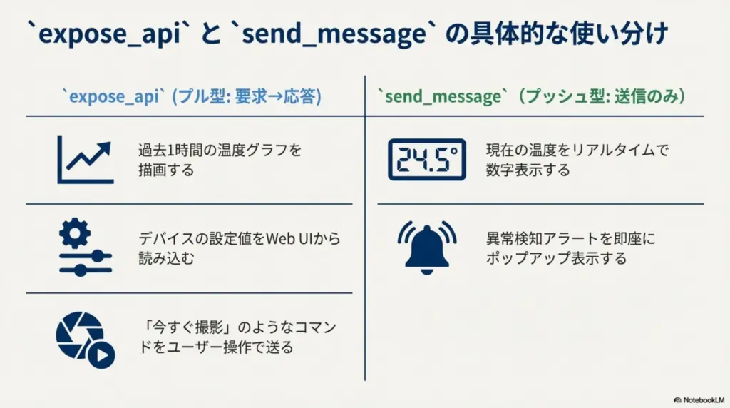 | expose_api | ui.expose_api() | Pull (要求→応答) | ・過去1時間の温度グラフを描画する ・設定値を読み込む ・「今すぐ撮影」のようなコマンドを送る |