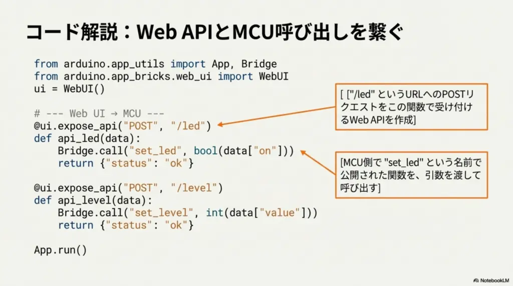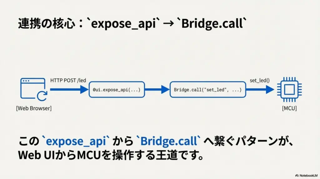 expose_api()→ Web UI から HTTP で叩けるBridge.call()→ MCU の関数を直接呼ぶ