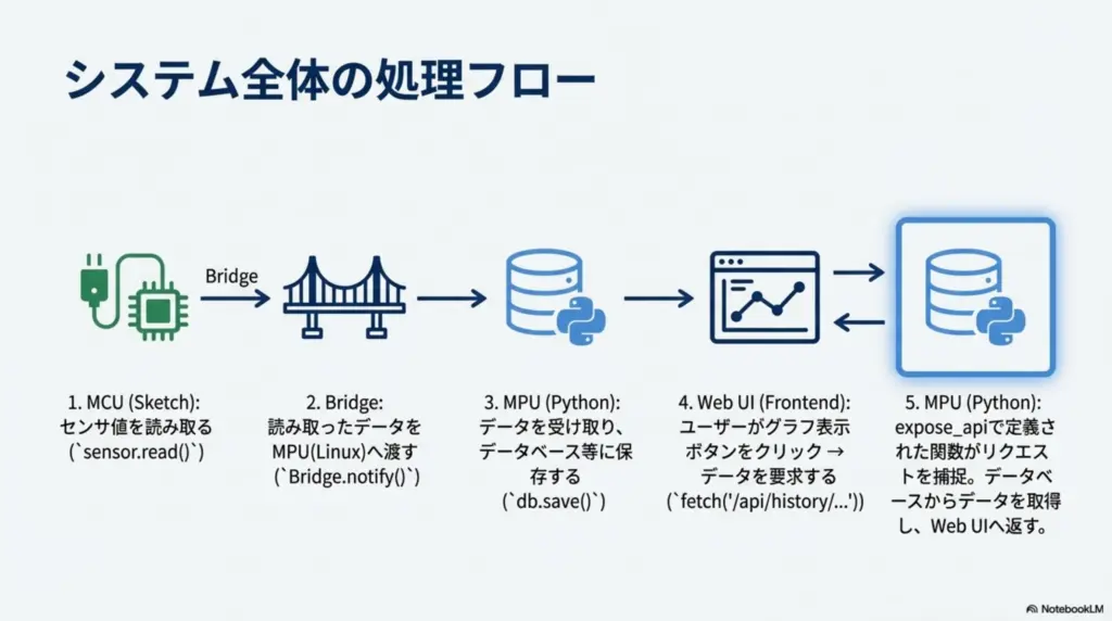 - ユーザーの作業: 自分のやりたいこと(グラフを出したい、LEDを消したい等)に合わせて具体的に記述します。