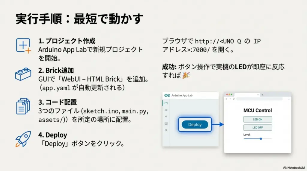 - Webサーバー は、Arduino UNO Q を外部と繋ぐための「受付窓口」です。
