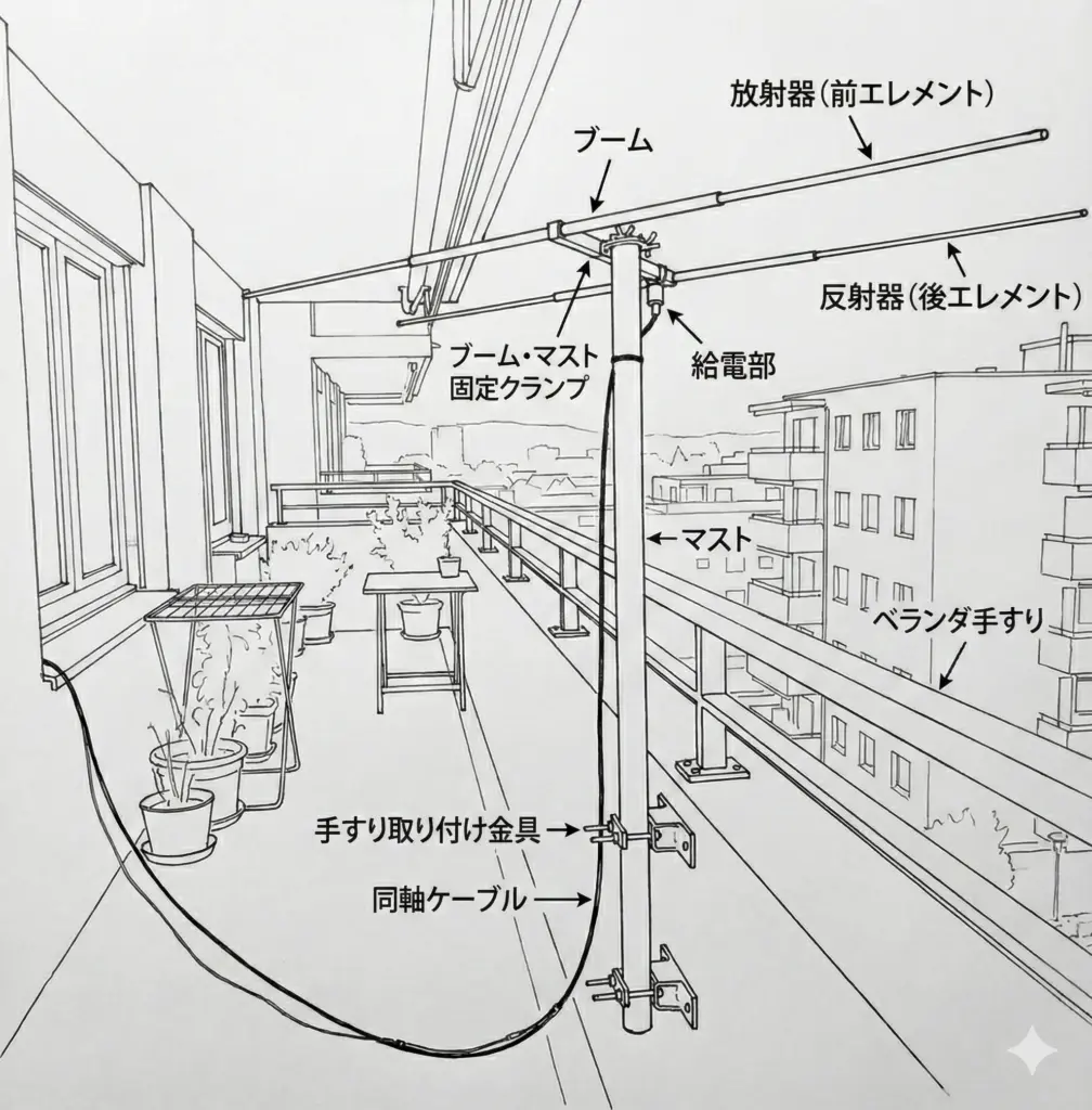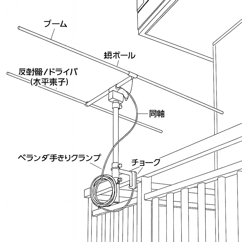 HB9CV(二素子ビーム)ベランダ設置 斜視外観図(144 MHz)
