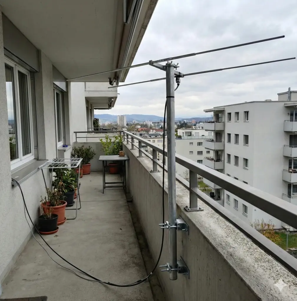 EHB9CVアンテナの形状を、Gemini 3 Proはよく分かっていないようだったので、先の記事でも使用したアンテナ画像を添付し、「マンションのベランダに取り付けた画像を作成してください」と指示した。