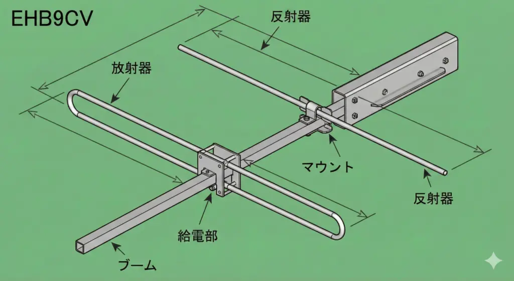 もし特定のメーカー製(コメットやダイヤモンドなど)の「EHB」という型番で、形状が大きく異なる場合(例えばV型ダイポールなど)は、詳細を教えていただければ修正いたします。一般的にはHB9CVはこの「H型」に近い形状をしています。