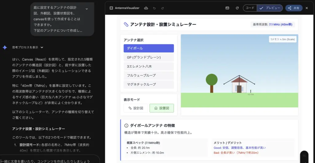 - あるいは、アンテナの図を描画するためのPythonコードがCanvas上に生成され、そのコードを実行した結果として図が表示されるかもしれません。「ブームの長さを少し変えて」と依頼すると、Geminiがコードの数値を書き換えて再実行し、図が更新される、といった対話的な操作が期待できます。