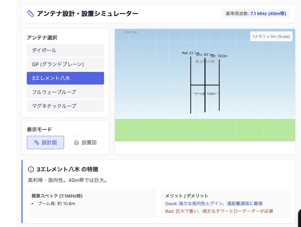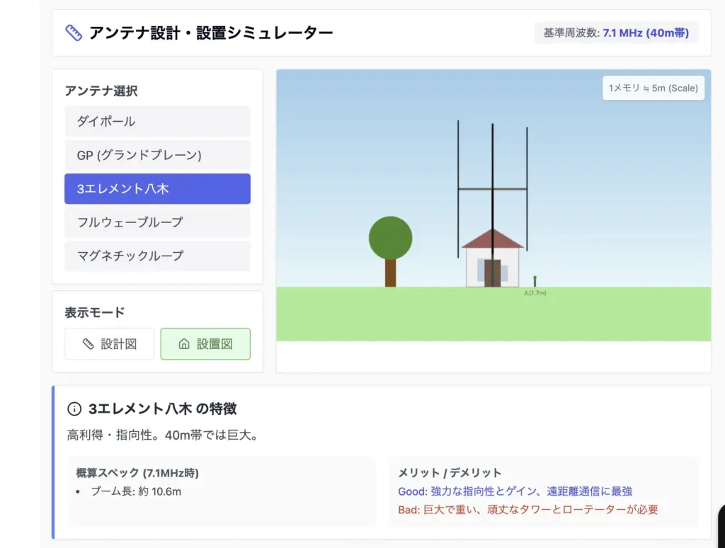特に「40m帯(7MHz)」を基準に設定しています。この周波数帯はアンテナが大きくなりがちで、種類によるサイズ感の違い(巨大な八木アンテナ vs 小さなマグネチックループなど)が非常によく分かります。