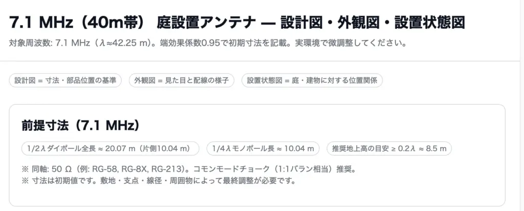 - 設計図モード: 各部の名称と、7MHz帯(波長約40m)を想定した概算寸法を表示します。