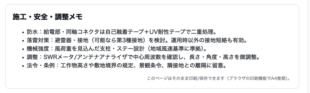 - 同軸:給電点直下にフェライト#43×10–15個でチョーク。屋外部は自己融着+耐候テープで防水。
