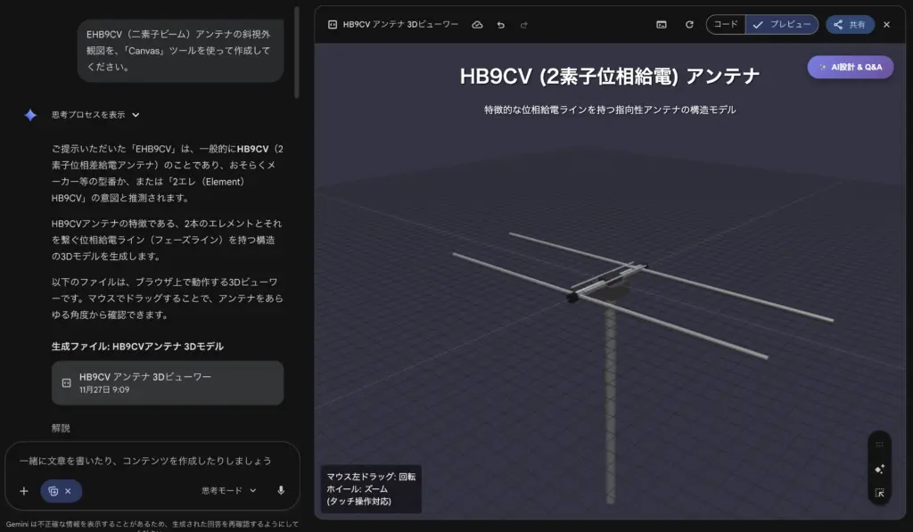 50.1MHz や144MHz)を入力すると、Geminiがその周波数に最適なHB9CVアンテナの寸法(ブーム長、エレメント長)を計算します。 - 計算結果は即座に3Dモデルに反映され、アンテナの形状が変化します(周波数が低いと巨大に、高いとコンパクトになります)。