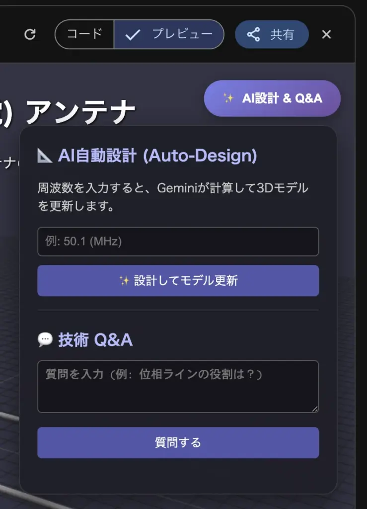 - AI自動設計 (Auto-Design): 希望する周波数(MHz)を入力すると、GeminiがHB9CVアンテナの最適なエレメント長やブーム長を計算し、3Dモデルの形状をリアルタイムに書き換えます。