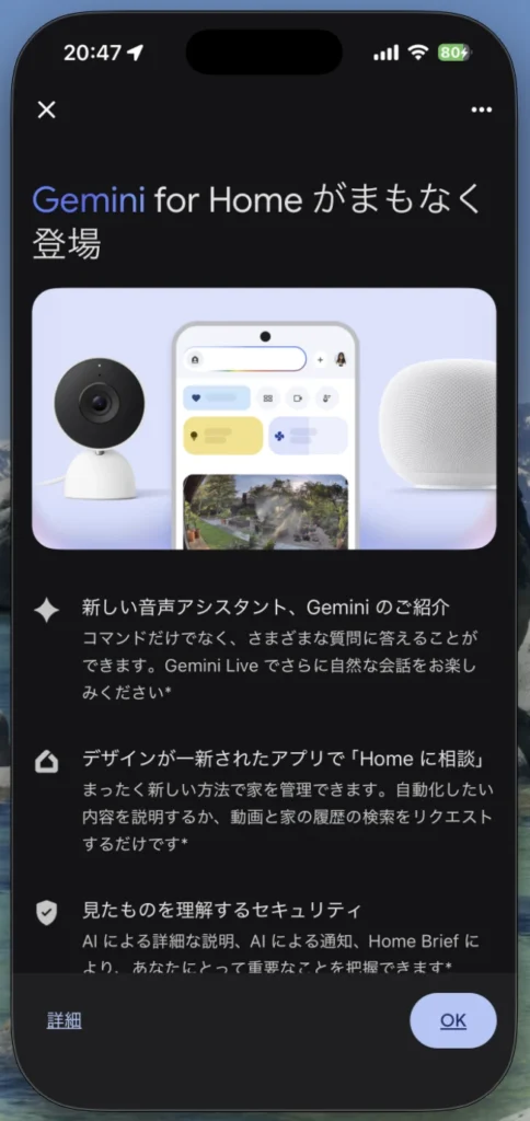 「Gemini for Home」は、Google Home(Nest)向けに Gemini を組み込んだ新しい体験の総称です。ざっくり言うと「Google Home アプリ/Nestデバイスの操作やカメラ履歴の理解を、生成AIで“会話っぽく”賢くする」アップデートです。 (blog.google)