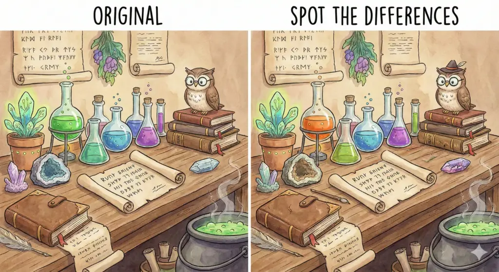 魔法使いの実験机には不思議なものがたくさん!よーく目を凝らして見てみましょう。