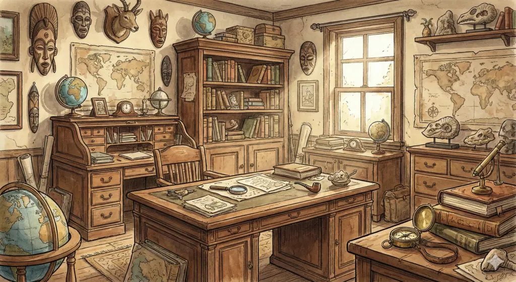 世界中を旅した老探検家の、物で溢れかえった書斎です。