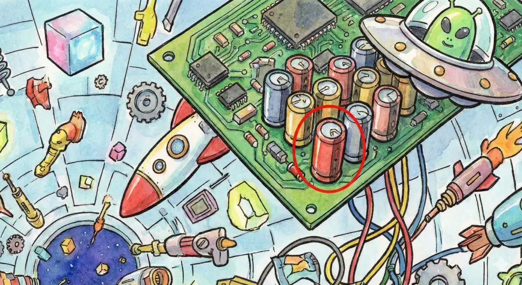 「3. おもちゃ箱をひっくり返した宇宙ステーション(SF&ポップ)」のテーマの画像で、「円筒形の部品(コンデンサ)がたくさん並んでいますが、その中に一つだけ赤と金の乾電池が混ざっています」と回答してもらっていますが、全てコンデンサで、乾電池は無いように思いますが、どうですか