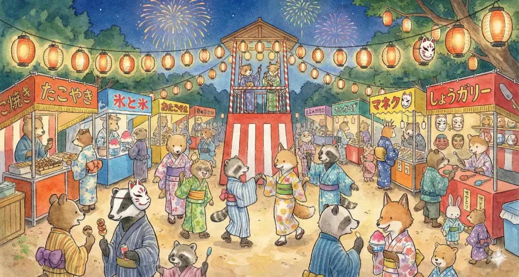 森の奥深くで、動物たちが浴衣を着て夏祭りを楽しんでいる賑やかな様子です。