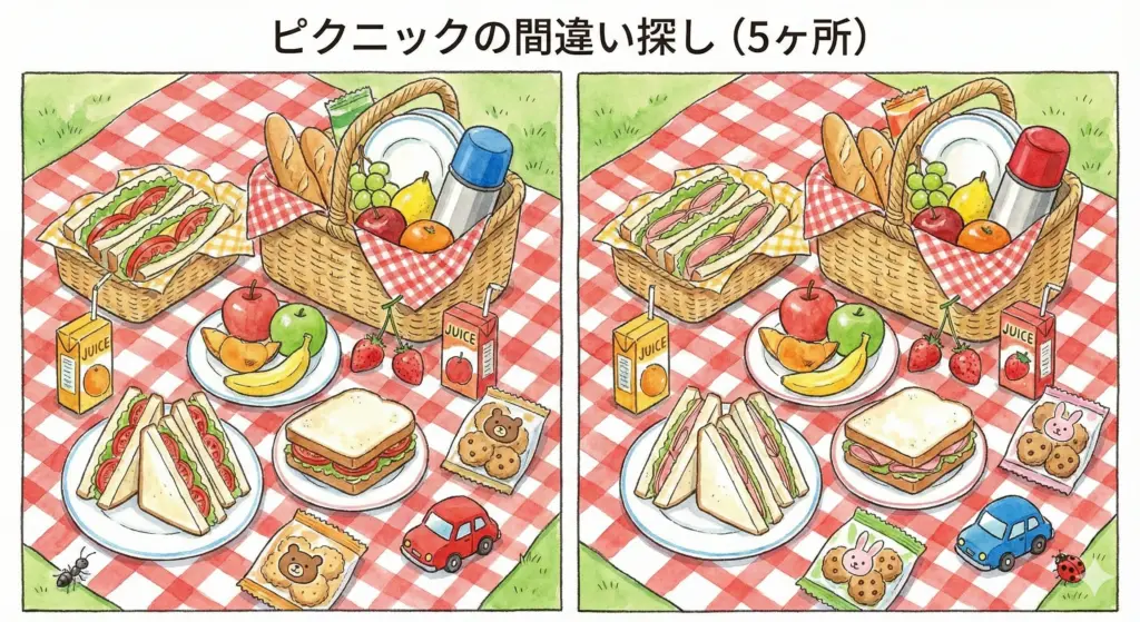 左右(または上下)に並べられた一見同じに見える2枚の画像を見比べて、色が違う、物が消えている、向きが違うなどの「違っている箇所」を探し出す、観察力が試される遊びです。