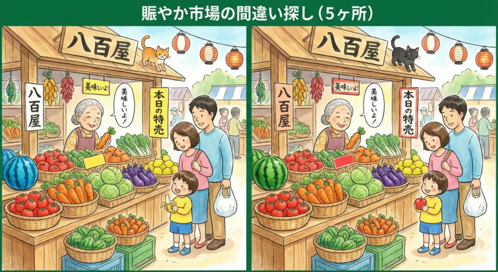 縦書きの「八百屋」の看板の色や、「美味しいよ!」という横書きの表示の色などが、正解に記載されておらず、間違いの数も間違っている。