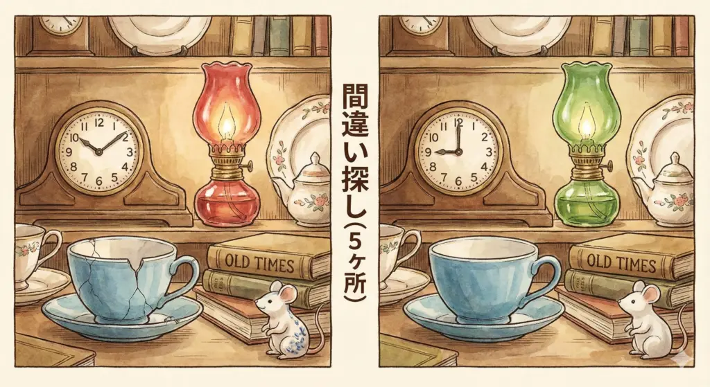 「右上の皿の模様の色:右上の棚にある白い皿の花の模様が、左の画像は赤っぽく、右の画像はピンク色(少し薄い色)になっています。」は誤りで、ヒントも間違っている。「左の白いティーカップの模様」が正しい。