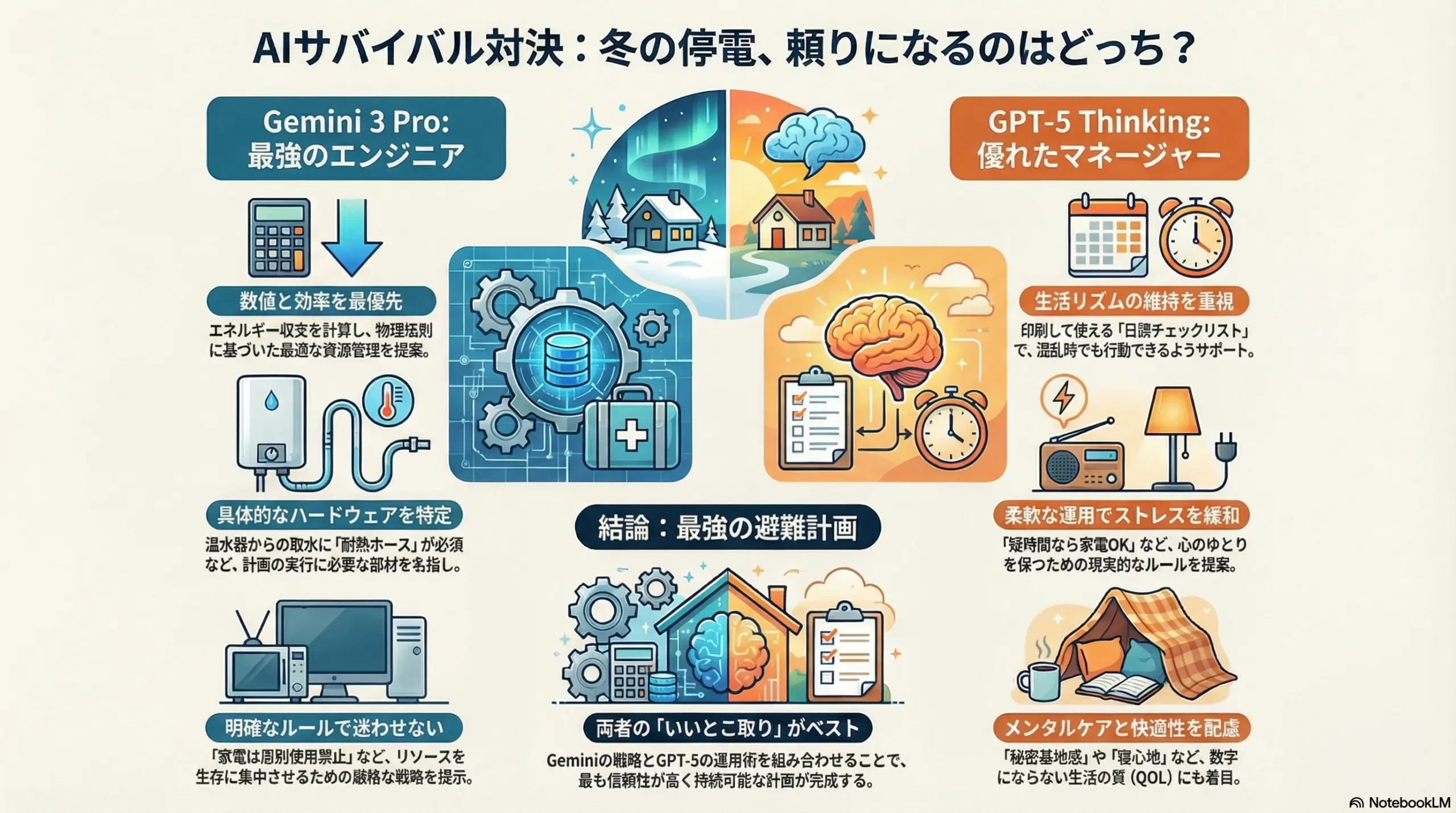 2つの記事(GPT-5 ThinkingとGemini 3 Pro)は、どちらも「冬の停電サバイバル」というテーマに対し非常に質の高い提案を行っていますが、アプローチのベクトルが異なります。