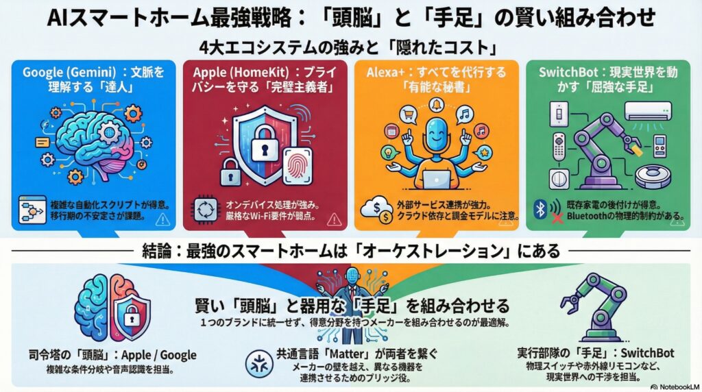| 観点 | Alexa+(Alexa) | Google(Gemini系 / Google Home) | Apple(Siri + ショートカット / HomeKit) | Home Assistant | SwitchBot |
