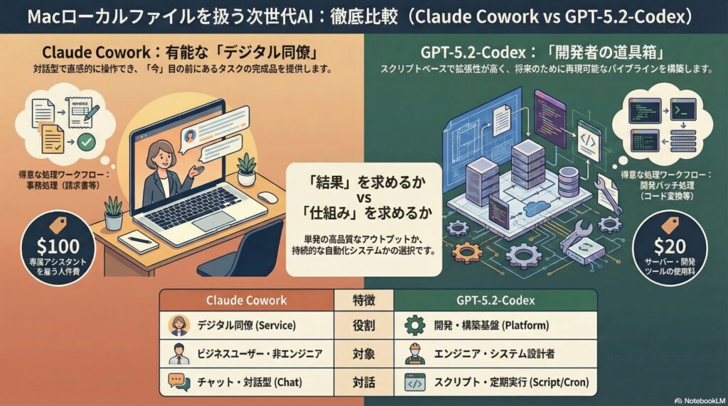 Claude CoworkとGPT‑5.2‑Codexアプリは、どちらも「Mac上のフォルダをAIに触らせて作業させる」ツールですが、狙っているユーザーと得意分野がかなり異なります。claude+7