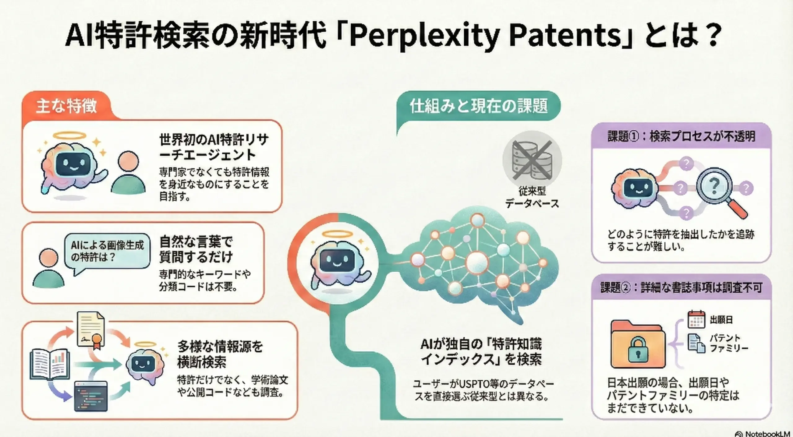 例えるなら、自分で図書館の特定の棚(USPTOなど)に行って目録カード(検索式)を引くのが従来の方法だとすれば、Perplexity Patentsは、図書館の全蔵書(特許、論文、コードなど全て)を熟知した司書(AIエージェント)に「こんな本を探している」と相談するようなものです。