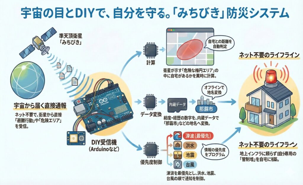 (みちびき(準天頂衛星システム))- これ、まさに「津波・洪水・地震・台風などを優先度つけてスマホに出したい」ニーズと相性が良い考え方です